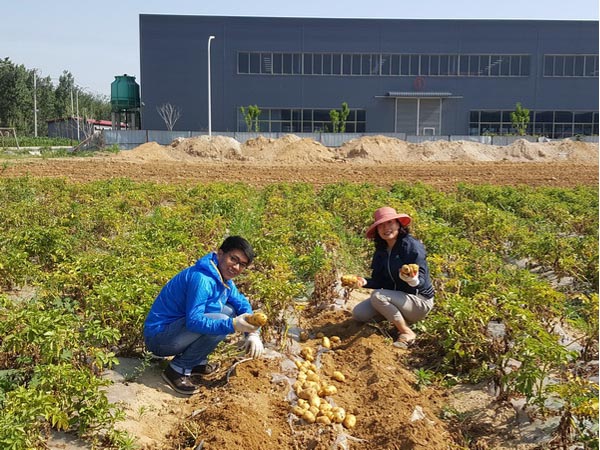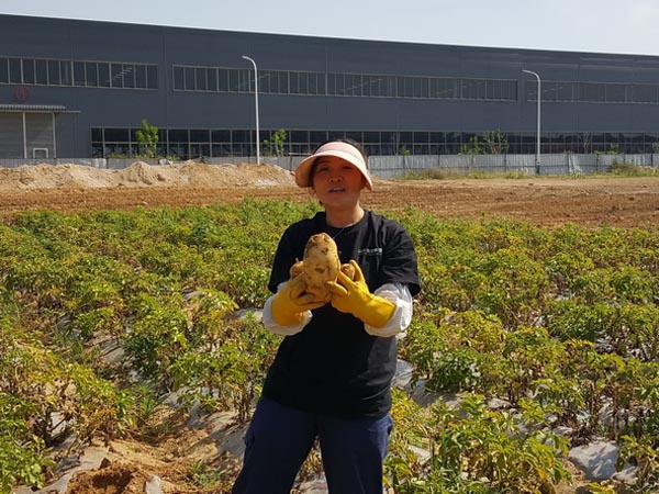 很多員工也是第1次刨土豆,不太了解這種被稱為“植物黃金”的收獲秘訣。土豆通過(guò)根莖生長(zhǎng),圍著根部生長(zhǎng)很靠近地面,喜歡松軟沙質(zhì)的土壤。經(jīng)過(guò)簡(jiǎn)單的指導(dǎo),大家很快找到了正確的要領(lǐng),只要輕輕拔掉葉苗,根尾的幾個(gè)小個(gè)子就先帶出來(lái),再稍稍扒開(kāi)一點(diǎn)土壤,躲藏在下面的胖大家伙就都乖乖的露出了大白肚皮。在豐收的田野上,大家發(fā)揚(yáng)風(fēng)格,挽起袖子、褲腿,彎下腰,掄起胳膊,開(kāi)始挖起來(lái),現(xiàn)場(chǎng)個(gè)個(gè)干勁十足、熱火朝天。刨出土豆的那一刻總是有些興奮,就象挖到寶藏,比賽著誰(shuí)挖到的個(gè)頭更大。一些被嚙齒類動(dòng)物咬過(guò)的土豆是不可以和健康土豆放在一起的,因?yàn)樗鼈儠?huì)導(dǎo)致更多土豆的腐爛。滿滿的種植知識(shí)分享,只有在親身勞作時(shí)才可以學(xué)到。隨后大家兵分幾路,負(fù)責(zé)搬運(yùn)的把土豆集中在一起,負(fù)責(zé)裝箱的將土豆按照大小進(jìn)行分揀裝箱,很快一箱箱新鮮的土豆被裝車運(yùn)往廚房。