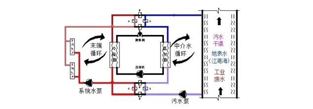 顧名思義,污水源熱泵系統(tǒng)就是從污水中提取和儲(chǔ)存能量的冷、熱源,借助熱泵機(jī)組,消耗少量電能,夏季把室內(nèi)熱量“提取”出來(lái)釋放到污水中,為室內(nèi)制冷;冬季把污水中的低位熱能“提取”出來(lái),為建筑物供熱。夏季制冷、冬季制熱工況通過(guò)切換閥門實(shí)現(xiàn),具體工作原理如圖所示。