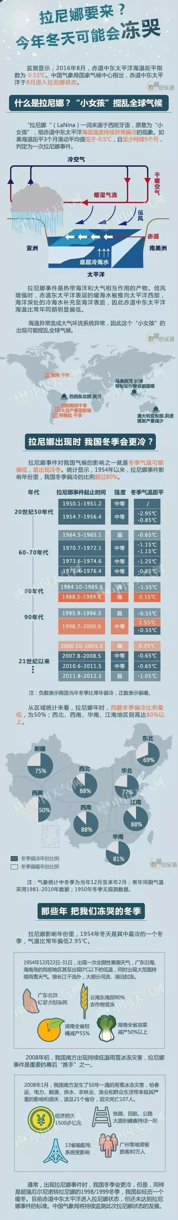 靠著空調(diào)給的命總算過完夏天,被凍成狗的冬季就要來了。中國氣象局國家氣候中心指出,赤道中東太平洋已于8月進入拉尼娜狀態(tài)。1950年以來的14次拉尼娜事件,影響我國17個冬季。除1950年冬季無數(shù)據(jù)外,其余16個冬季中有13個比常年同期更冷。